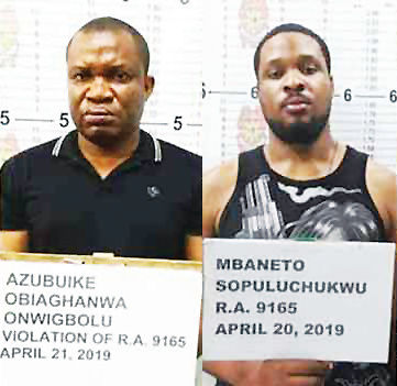 An duwang Nigerian nationals na sinda Mbaneto Sopuluchukwu na midbid sa alias na Herman Kurt Philip, 22 años, soltero na nag-eerok sa Acacia Estage, Manila na nadakop sa Brgy. Dinaga, Ciudad nin Naga asin Azubuike Obiaghanwa Onwigbolu, 32 años, na nag-eestar sa Ciudad nin Angeles asin nadakop sa Zona Tres, Triangulo kan ciudad na ini.