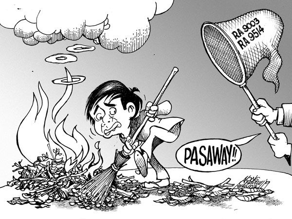 Republic Act No. 9003 makes it unlawful to burn solid waste and other dry materials, such as dry leaves, paper, and other trash. Violators will be fined P1,000 to P3,000 or be imprisoned for 15 days to six months. Then there is also R. A. 9514, otherwise known as the Fire Code of the Philippines which bans burning because they contribute to air pollution, endanger fire, and bring health hazards to affected residents.
